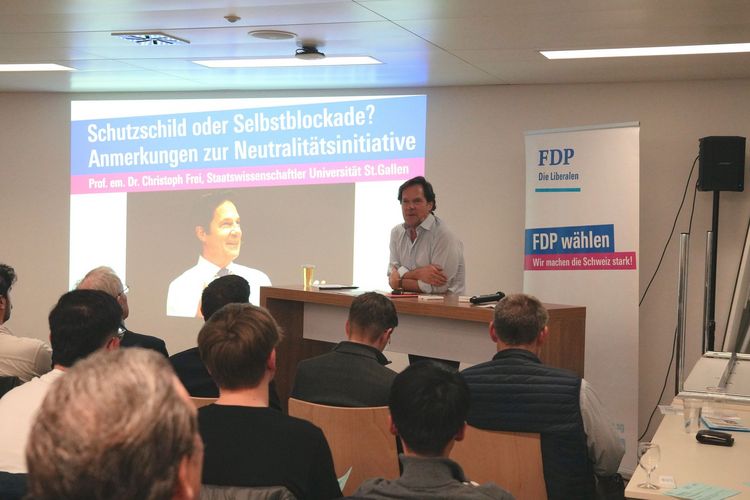 Zur sogenannten Neutralitätsinitiative hielt Professor Christoph Frei, Staatswissenschaftler an der Universität St.Gallen, ein Impulsreferat. Er zeigte in zehn Punkten auf, dass Neutralität in der Schweizer Geschichte nie Selbstzweck war, sondern stets ein Instrument zur Sicherung der Interessen und der Sicherheit unseres Landes. Eine starre Verankerung in der Verfassung würde diesen Handlungsspielraum unnötig einschränken. Im anschliessenden Podium diskutierten FDP-Vizefraktionspräsident Ruben Schuler und SVP-Fraktionspräsident Sascha Schmid, moderiert von FDP-Vizepräsident Sven Bradke. Schmid argumentierte, die Welt brauche weiterhin neutrale Staaten wie die Schweiz, die in internationalen Konflikten vermitteln zu können. Schuler betonte, die Neutralität gehöre zur Schweiz und habe sich bewährt. Sie dürfe jedoch nicht in ein starres Korsett gezwängt werden. Die Initiative würde die sicherheitspolitische Handlungsfähigkeit der Schweiz einschränken, die Verteidigungsfähigkeit schwächen und die Schweizer Rüstungsindustrie gefährden – und damit letztlich auch die Versorgung der eigenen Armee. Die Mitgliederversammlung beschloss schliesslich einstimmig die Nein-Parole.